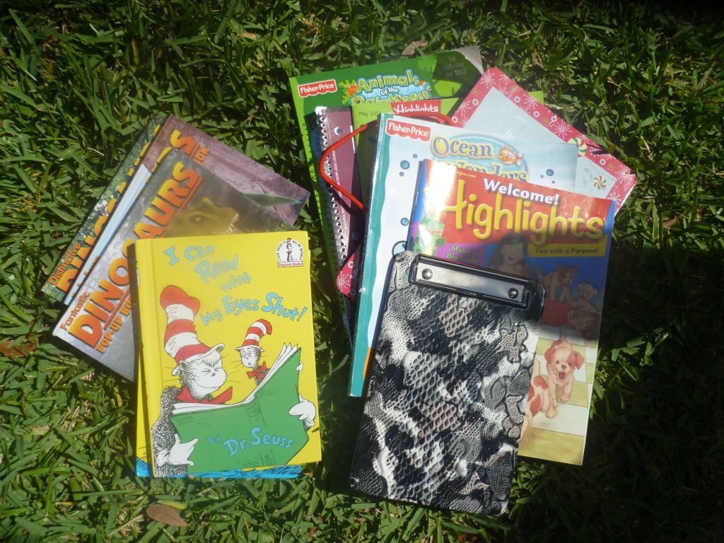 Some learning games - math and spelling as well as some crayons. (No the crayons didn't melt surprisingly in the Florida sun)