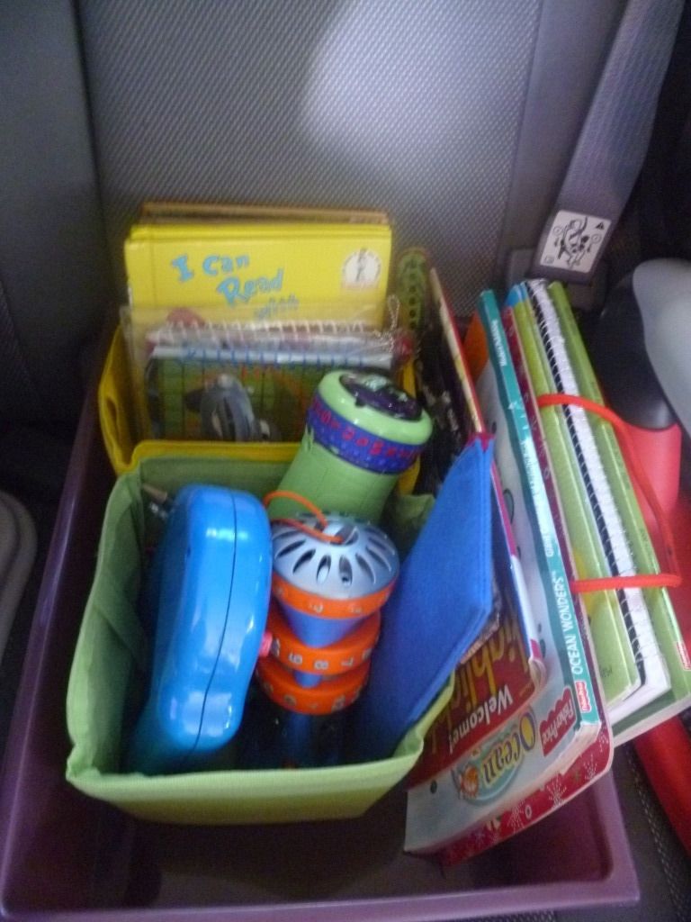 The I add the books in one basket, the games, pencils and erasers in another basket and the coloring books and notebooks on the side in the larger bin.